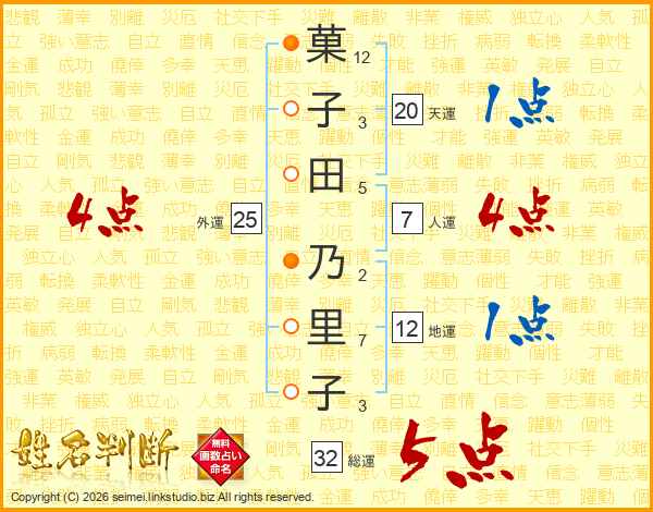 菓(12画)子(3画)田(5画) 乃(2画)里(7画)子(3画)