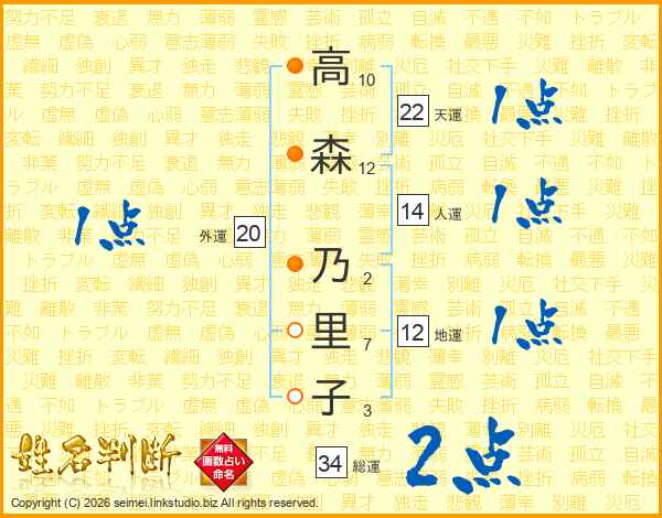 高(10画)森(12画) 乃(2画)里(7画)子(3画)