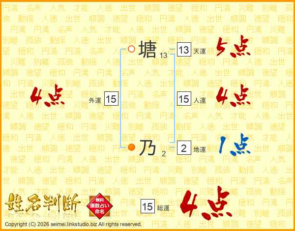 生活面を象徴する運勢です。外部から受ける影響力を表し、結婚運、家庭運や職場、環境への順応性を表します。総運から人運を引いた画数。姓や名が1文字の場合を除く。