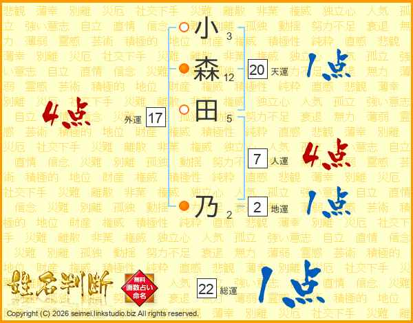 生活面を象徴する運勢です。外部から受ける影響力を表し、結婚運、家庭運や職場、環境への順応性を表します。総運から人運を引いた画数。姓や名が1文字の場合を除く。