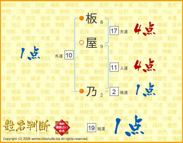 板(8画)屋(9画) 乃(2画)