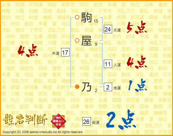 駒屋乃さんの総運は26画の2点!