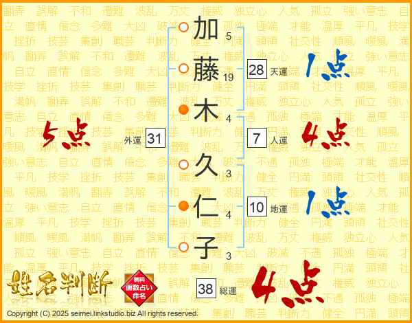 加(5画)藤(19画)木(4画) 久(3画)仁(4画)子(3画)