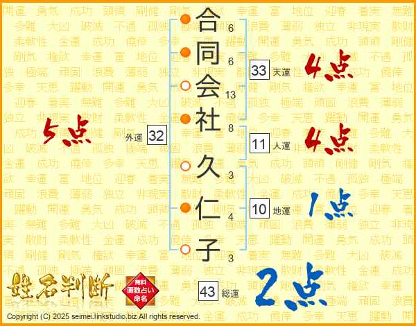 合(6画)同(6画)会(13画)社(8画) 久(3画)仁(4画)子(3画)