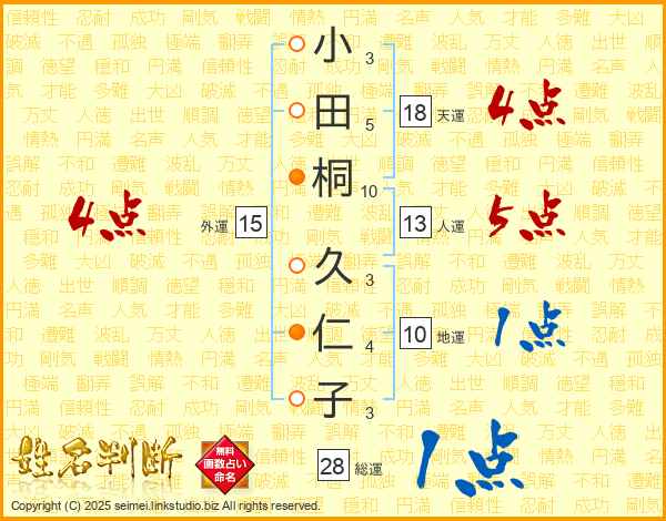 小(3画)田(5画)桐(10画) 久(3画)仁(4画)子(3画)