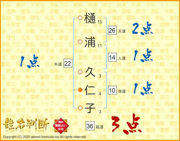 樋(15画)浦(11画) 久(3画)仁(4画)子(3画)