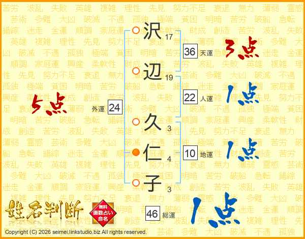 沢(17画)辺(19画) 久(3画)仁(4画)子(3画)