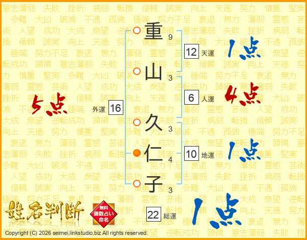 重山久仁子さんの総運は22画の1点!