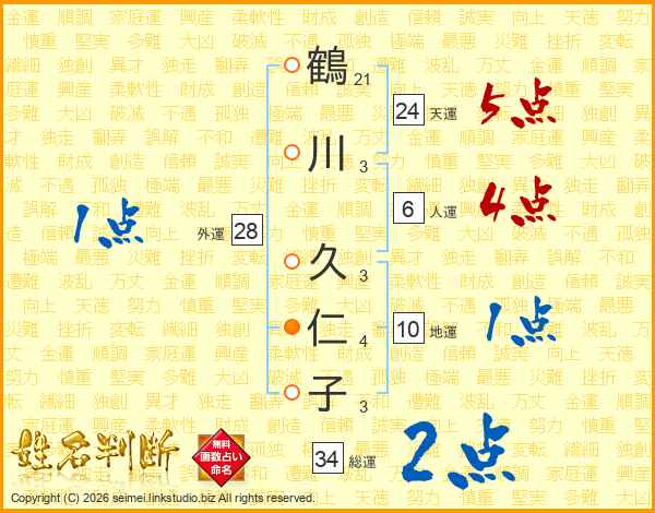 鶴(21画)川(3画) 久(3画)仁(4画)子(3画)