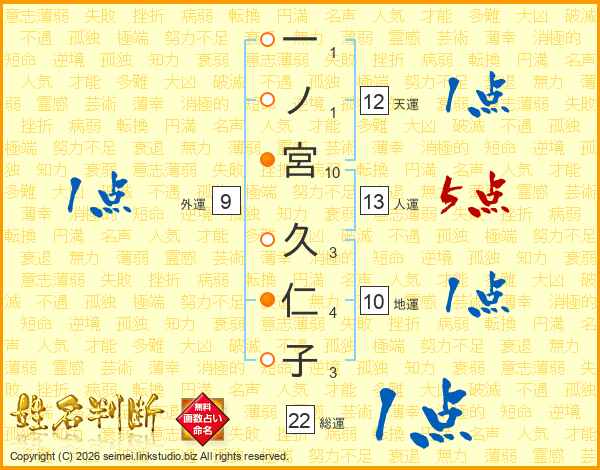 一(1画)ノ(1画)宮(10画) 久(3画)仁(4画)子(3画)