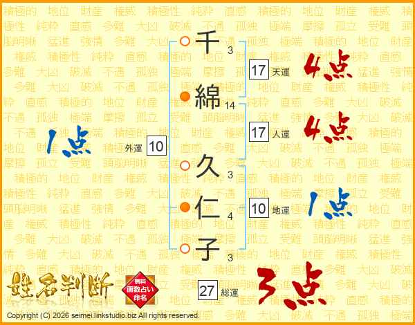 千(3画)綿(14画) 久(3画)仁(4画)子(3画)