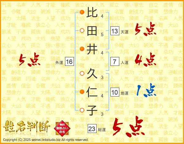 比(4画)田(5画)井(4画) 久(3画)仁(4画)子(3画)