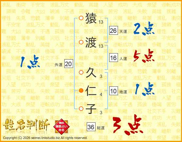 猿(13画)渡(13画) 久(3画)仁(4画)子(3画)