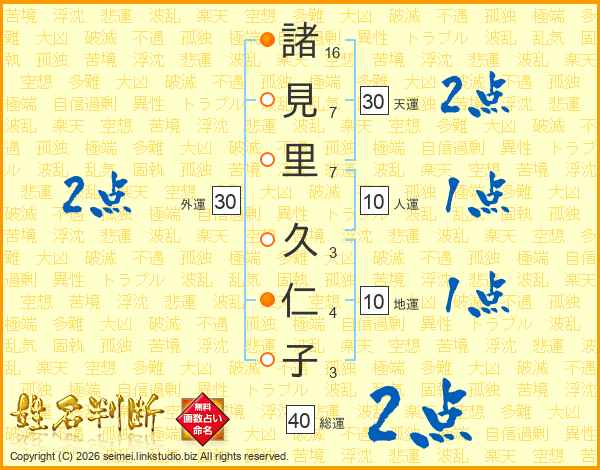 諸(16画)見(7画)里(7画) 久(3画)仁(4画)子(3画)
