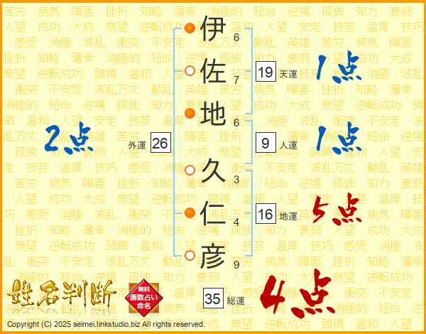 伊(6画)佐(7画)地(6画) 久(3画)仁(4画)彦(9画)