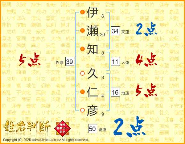 伊(6画)瀬(20画)知(8画) 久(3画)仁(4画)彦(9画)
