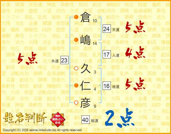 倉嶋久仁彦さんの総運は40画の2点!