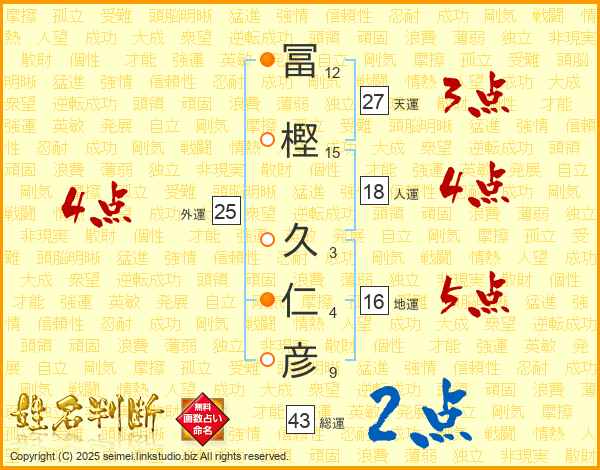 冨(12画)樫(15画) 久(3画)仁(4画)彦(9画)