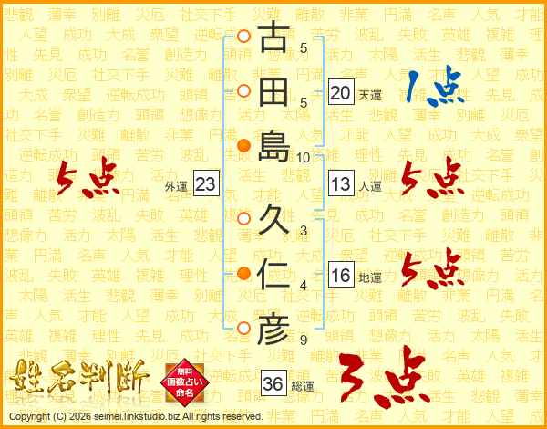 古(5画)田(5画)島(10画) 久(3画)仁(4画)彦(9画)