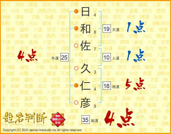 日(4画)和(8画)佐(7画) 久(3画)仁(4画)彦(9画)
