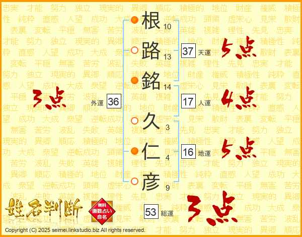 根(10画)路(13画)銘(14画) 久(3画)仁(4画)彦(9画)