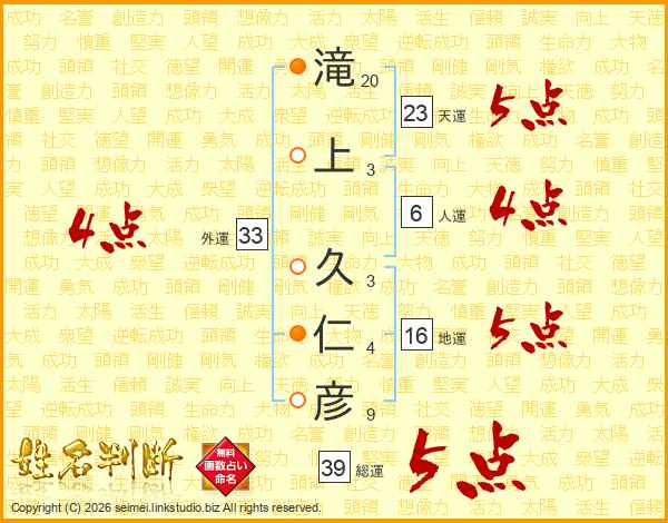滝(20画)上(3画) 久(3画)仁(4画)彦(9画)