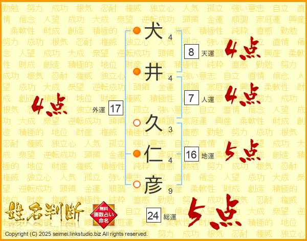 犬(4画)井(4画) 久(3画)仁(4画)彦(9画)