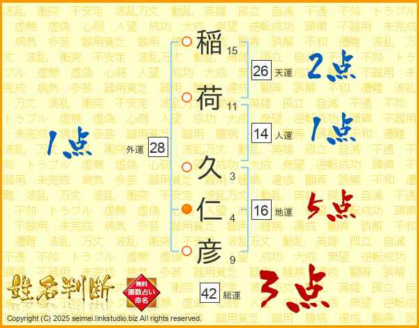 稲(15画)荷(11画) 久(3画)仁(4画)彦(9画)