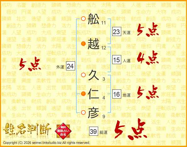 舩(11画)越(12画) 久(3画)仁(4画)彦(9画)