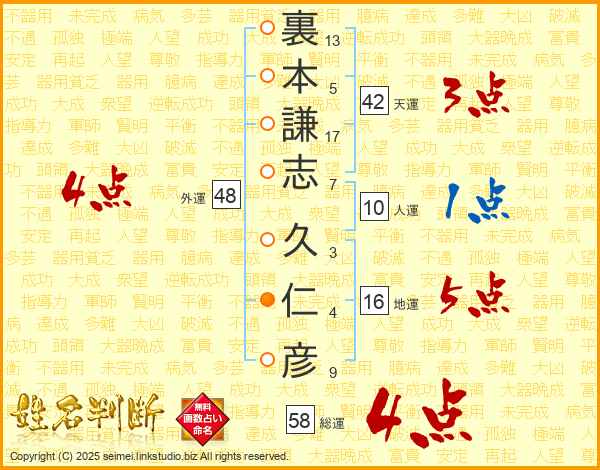 裏(13画)本(5画)謙(17画)志(7画) 久(3画)仁(4画)彦(9画)