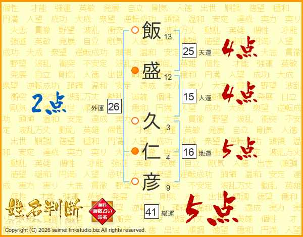 飯(13画)盛(12画) 久(3画)仁(4画)彦(9画)