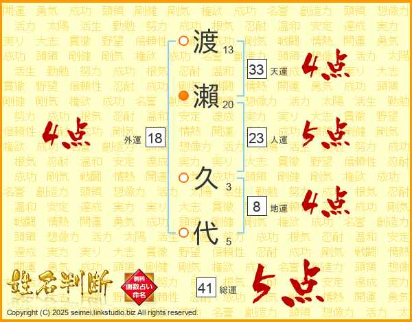 渡(13画)瀨(20画) 久(3画)代(5画)