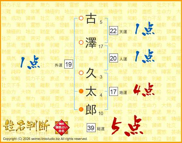 古(5画)澤(17画) 久(3画)太(4画)郎(10画)
