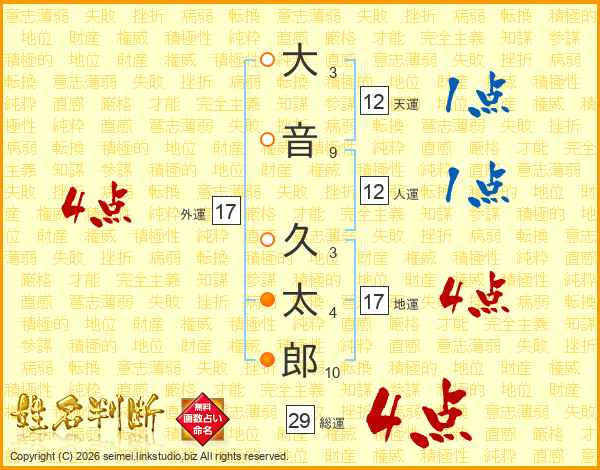 大(3画)音(9画) 久(3画)太(4画)郎(10画)