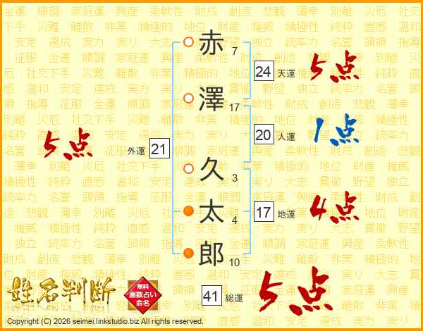 赤(7画)澤(17画) 久(3画)太(4画)郎(10画)
