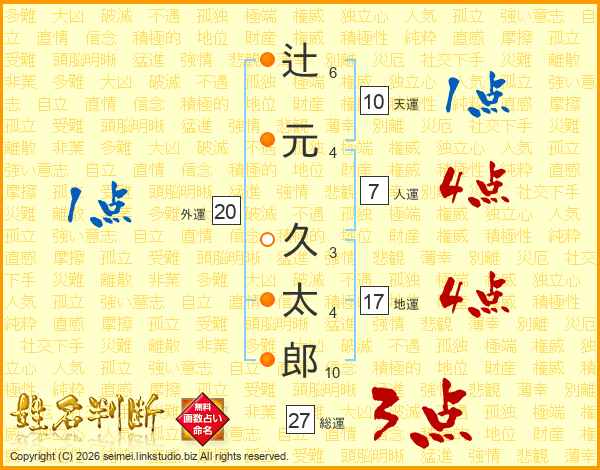 辻(6画)元(4画) 久(3画)太(4画)郎(10画)