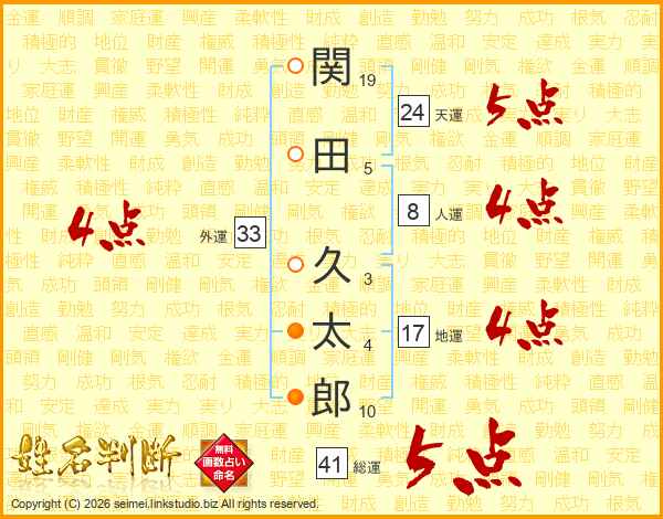 関(19画)田(5画) 久(3画)太(4画)郎(10画)