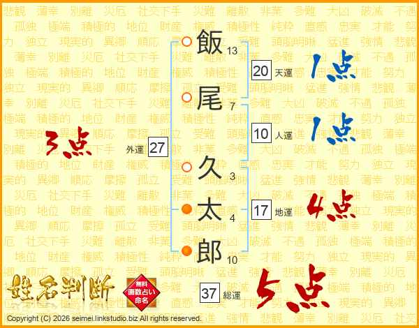 飯(13画)尾(7画) 久(3画)太(4画)郎(10画)