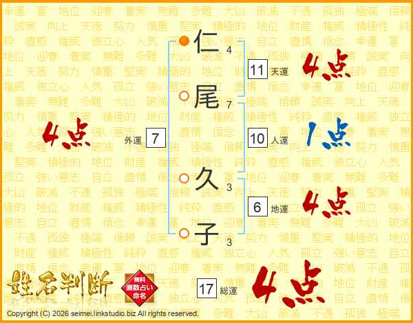 生活面を象徴する運勢です。外部から受ける影響力を表し、結婚運、家庭運や職場、環境への順応性を表します。総運から人運を引いた画数。姓や名が1文字の場合を除く。