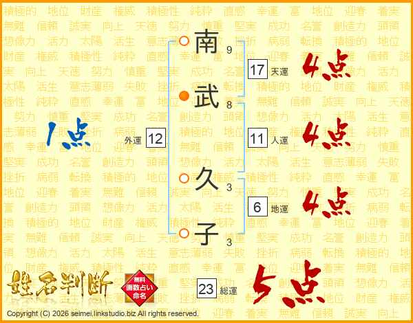 生活面を象徴する運勢です。外部から受ける影響力を表し、結婚運、家庭運や職場、環境への順応性を表します。総運から人運を引いた画数。姓や名が1文字の場合を除く。