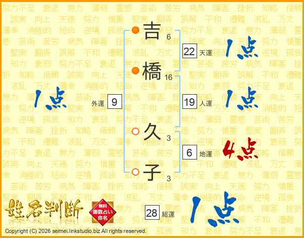 吉(6画)橋(16画) 久(3画)子(3画)