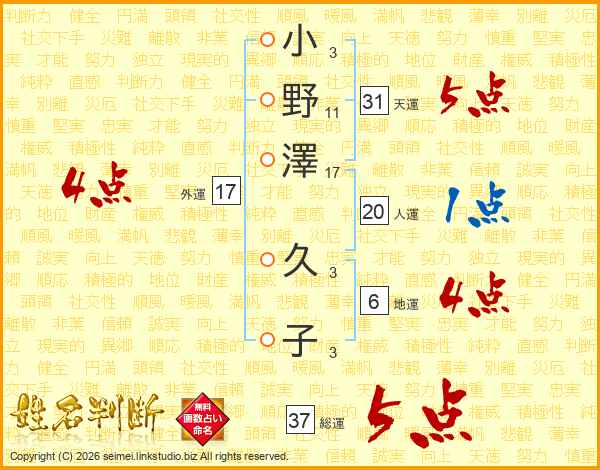 小野澤久子さんの総運は37画の5点!