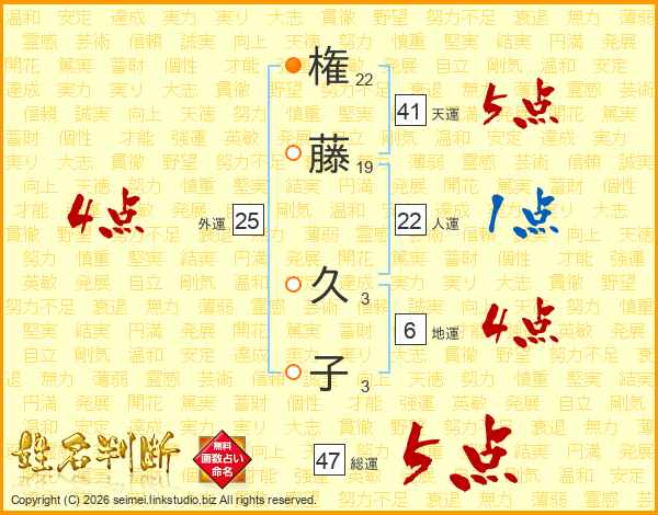 権(22画)藤(19画) 久(3画)子(3画)