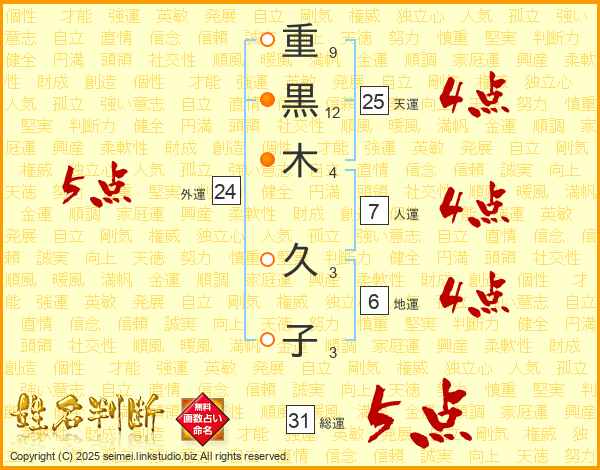重(9画)黒(12画)木(4画) 久(3画)子(3画)