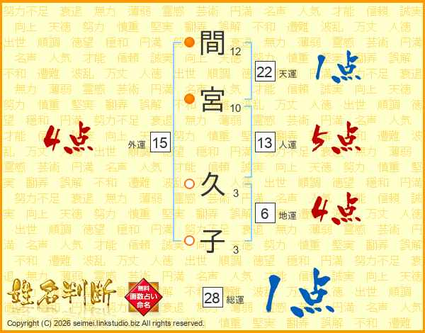 生活面を象徴する運勢です。外部から受ける影響力を表し、結婚運、家庭運や職場、環境への順応性を表します。総運から人運を引いた画数。姓や名が1文字の場合を除く。
