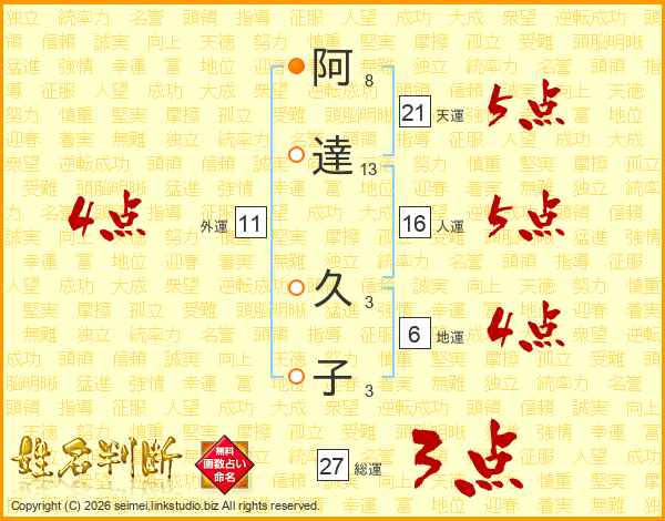 阿(8画)達(13画) 久(3画)子(3画)