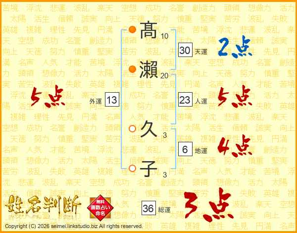 髙瀨久子さんの人運は23画の5点!