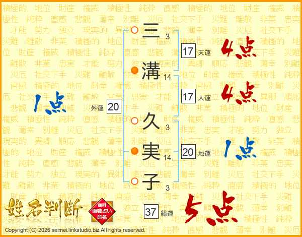 生活面を象徴する運勢です。外部から受ける影響力を表し、結婚運、家庭運や職場、環境への順応性を表します。総運から人運を引いた画数。姓や名が1文字の場合を除く。