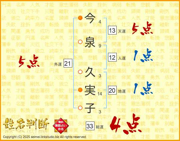 今(4画)泉(9画) 久(3画)実(14画)子(3画)