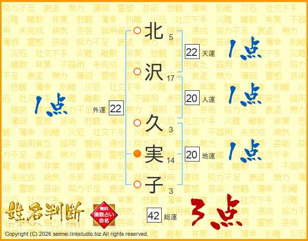 北(5画)沢(17画) 久(3画)実(14画)子(3画)